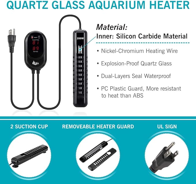 AQQA Aquarium Heater 200W for 45-80 Gallon Submersible Fish Tank Heater for Aquarium Betta Fish Heater Aquarium Thermostat Heater Freshwater and Saltwater (200W for 45-80 Gal)