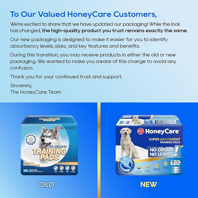 HONEY CARE All-Absorb, XXL 30"x36", 30 Count, Dog and Puppy Training Pads, Ultra Absorbent and Odor Eliminating, Leak-Proof 5-Layer Potty Training Pads with Quick-Dry Surface, Blue, A39
