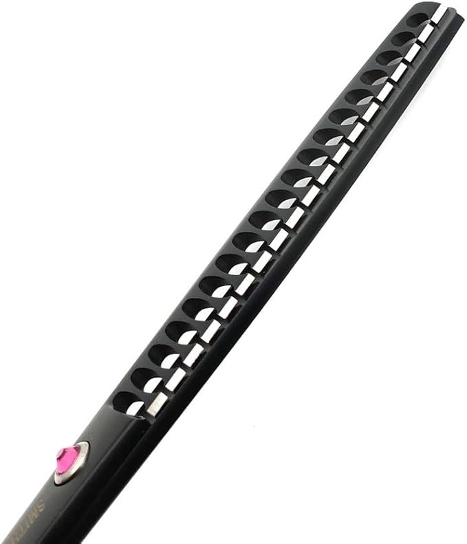 - SHARP EDGE. The edge line of the blade is evenly polished,which make the scissors durably sharp.With meticulously crafted clear tip of tooth ,the thinning scissors are sharp and do not clip the hair.The edge of the curved scissors is 25°-30°,majority standard angle to satisfy most part of groomers.