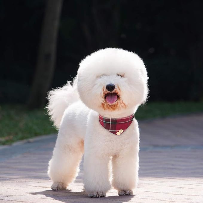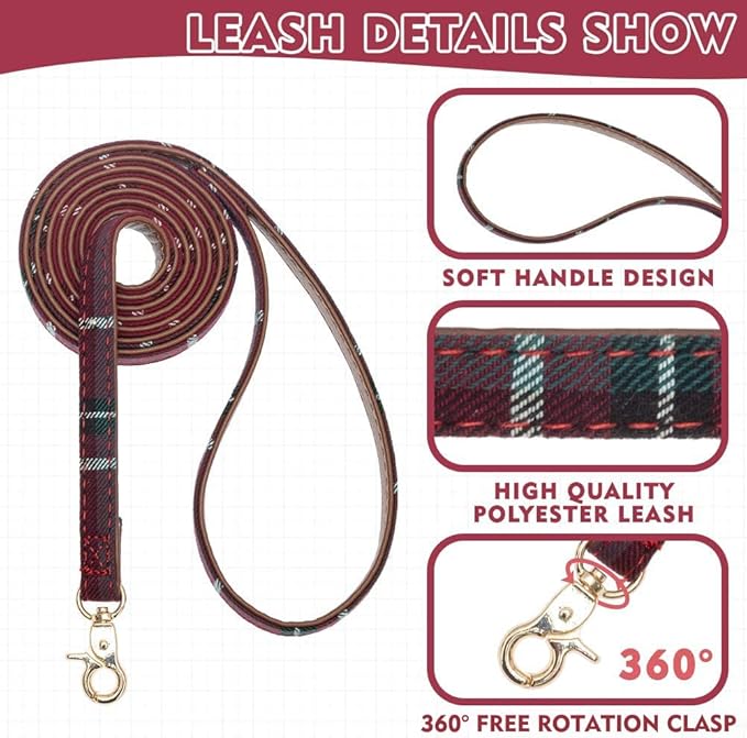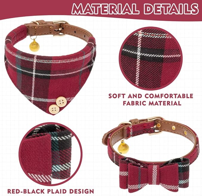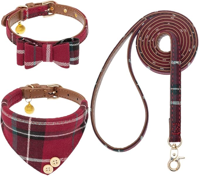 EXPAWLORER Dog Collar and Leash Set - Classic Plaid Dog Bow Tie and Dog Bandana Collar with Bell, Dog Leash Tangle Free, Adjustable Collars for Small Medium Large Dogs Cats, Holiday Ideal Gift