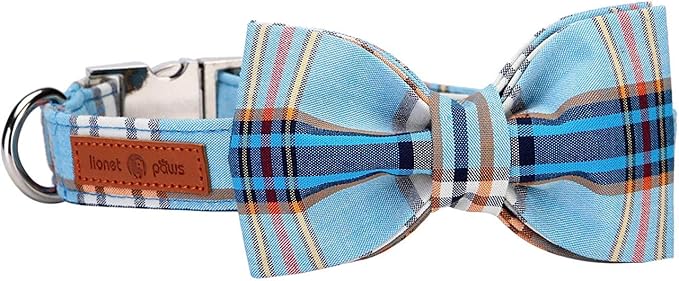 Lionet Paws Boy Dog Collar with Bowtie, Comfortable Adjustable Cute Blue Plaid Bow Tie Collar for Male Puppies and Cats Gift, XXS, Neck 7-11 inches