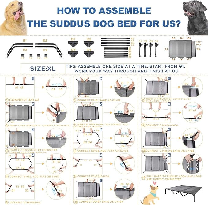 Suddus Elevated Dog Bed for Large Dogs 140lb, Breathable Cooling Raised Dog Cot with Dual Support Bars & Metal Frame, No-Slip Feet, Waterproof Pet Bed for Indoor/Outdoor, X-Large, 48 * 36 * 9in, Grey
