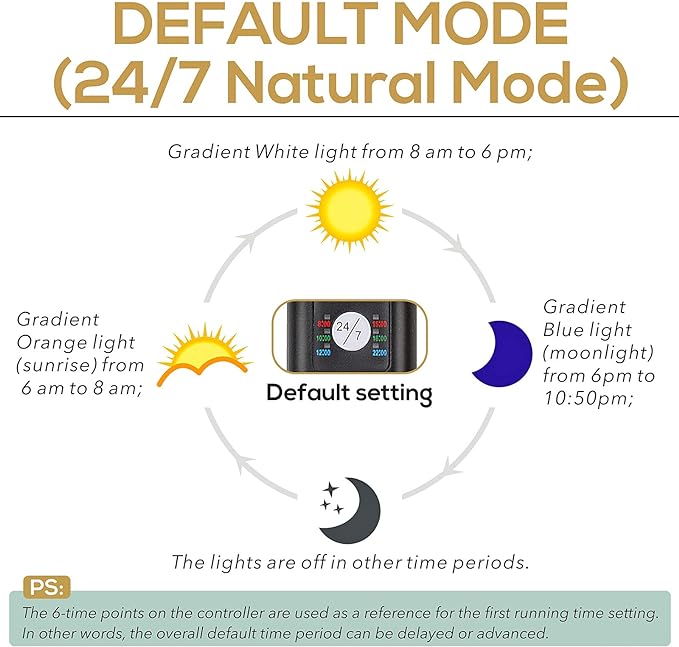 About This DEFAULT MODE(24/7 Natural Mode): Gradient Orange light (sunrise) from 6 am to about 8 am; Gradient White light... Read more