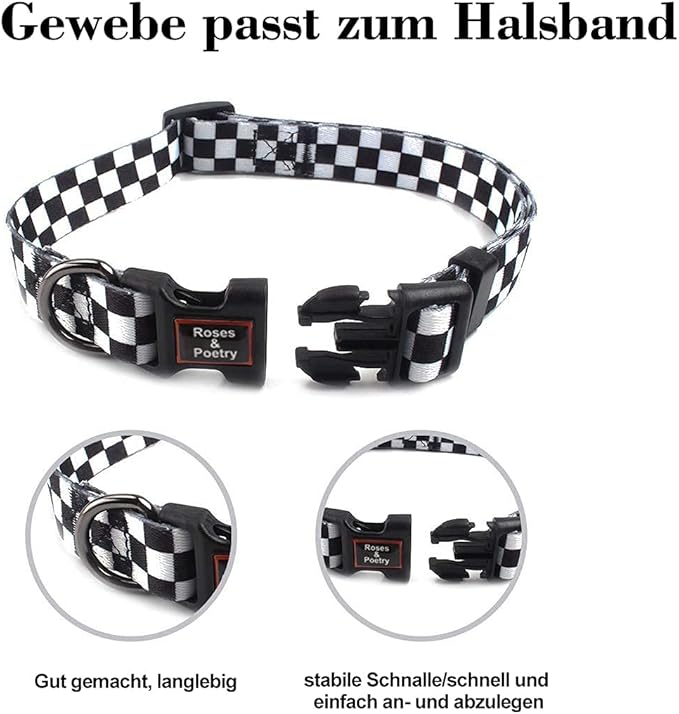 Roses&Poetry Dog Collar with Colourful Checkered Patterns, Adjustable Durable Puppy Collars for Small Medium Large Dogs (Black & White-S)