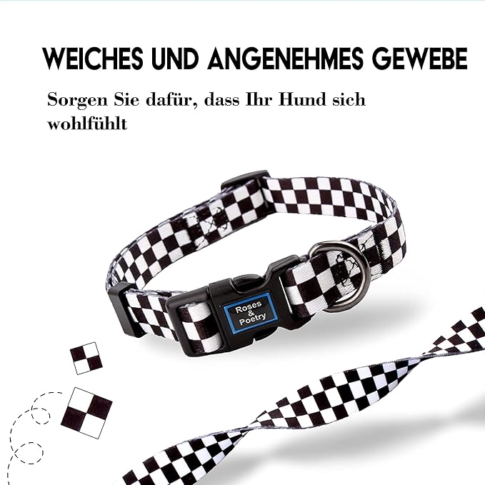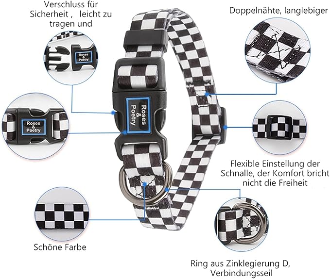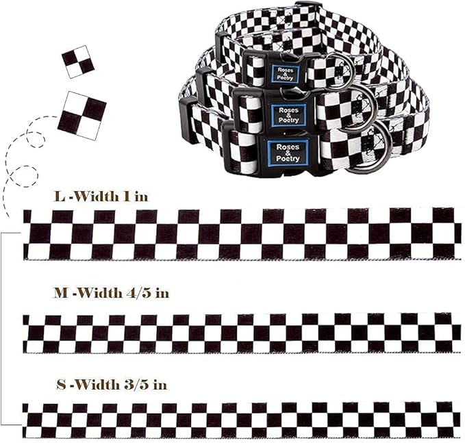 Roses&Poetry Dog Collar with Colourful Patterns, Adjustable Durable Puppy Collars for Small Medium Large Dogs (Black & White-L)