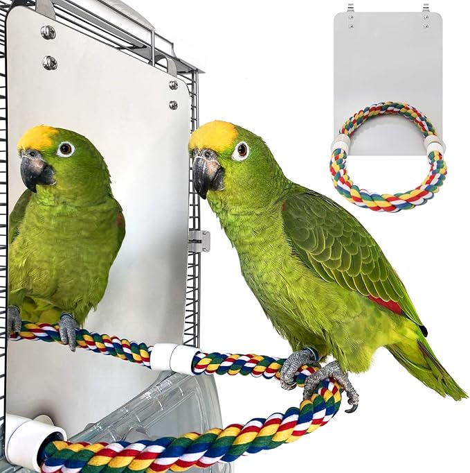 BWOGUE Large Stainless Steel Bird Mirror with Rope Perch Cockatiel Mirror for Cage Bird Toys Swing Parrot Cage Toys for Parakeet Cockatoo Cockatiel Conure Lovebirds Finch Canaries (10.6 Inch)