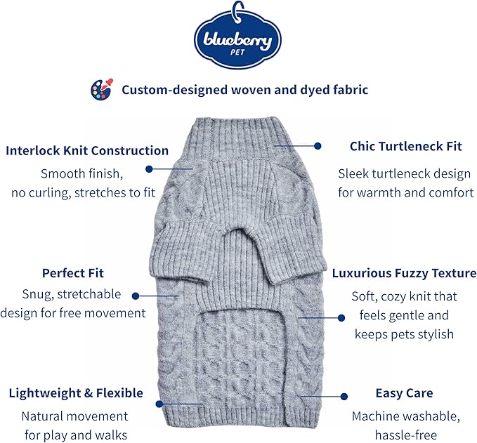 Blueberry Pet Classic Fuzzy Textured Knit Pullover Turtle-Neck Dog Sweater in Heather Grey, Back Length 10", Pack of 1 Clothes for Dogs