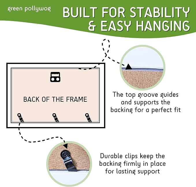 - EASY TO HANG – The durable yet lightweight picture frame is simple to hang, requiring no special anchors. Green Pollywog’s unique design features a solid brass wall hanging mount for easy displays in bedrooms, living rooms, and throughout your home. The frame corners are double-reinforced, ensuring enduring quality for a lifetime of fondness and appreciation. Note: fit the backing into the indentation at top and secure the bottom with the knobs.