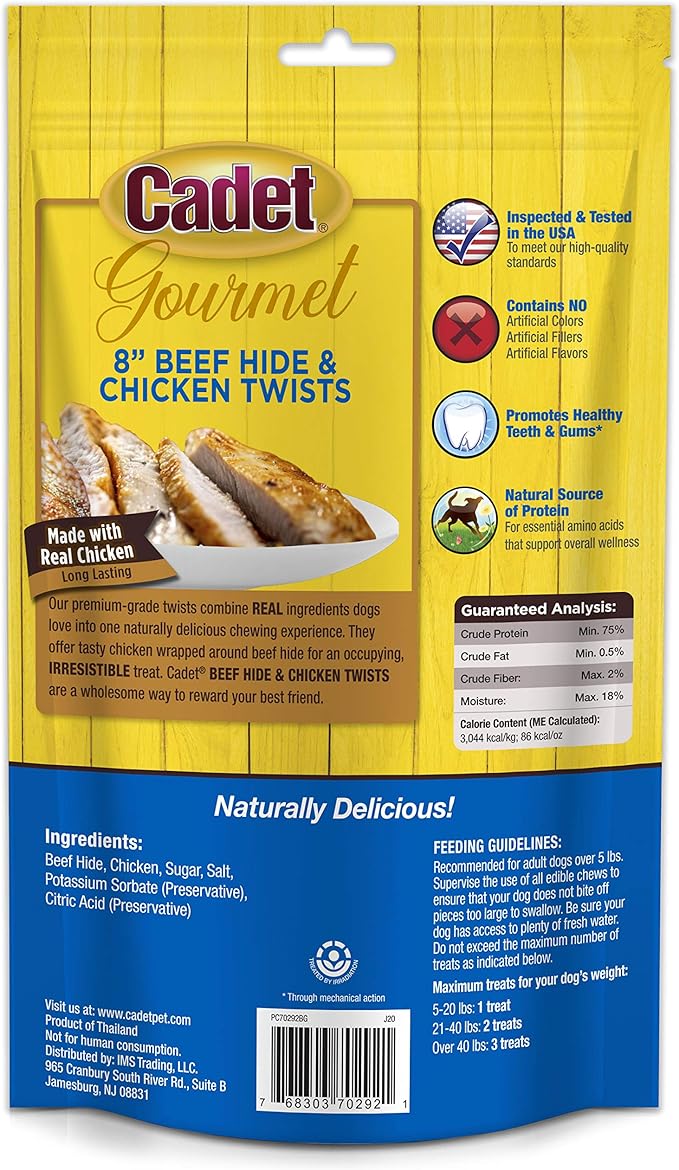 Cadet Gourmet 8-Inch Beef Hide Twist Chew Sticks, Long-Lasting and Natural Rawhide Chews for Dogs, Inspected & Tested in USA, Chicken Flavor, 6 Count