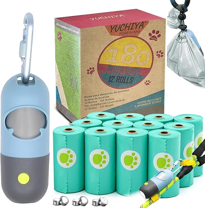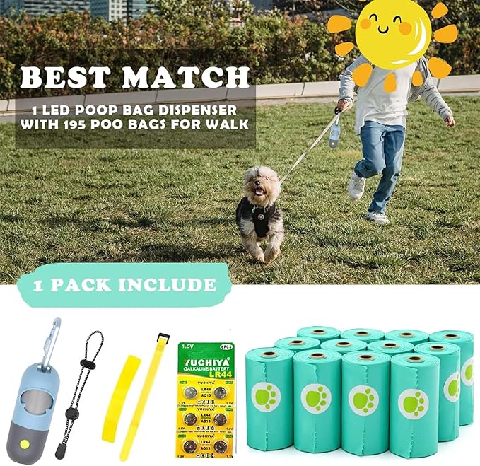 Dog Poop Bags Holder with LED Flashlight|Pet Waste Bags Dispenser for Leash|Doggie Potty Bags Container with Leak-proof Pet Trash Bags and Accessories (1 Holder 195 Bags, Sky Blue)