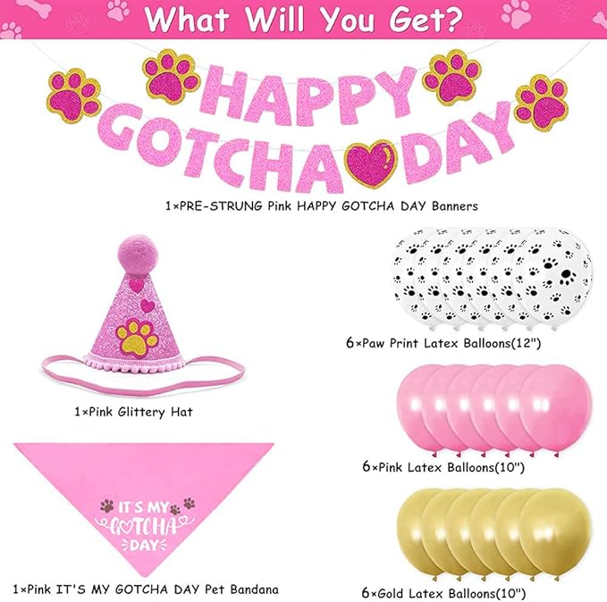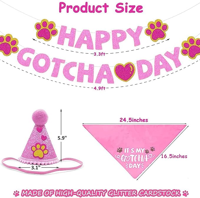 Happy Gotcha Day Dog Bandana- Dog Birthday Party Supplies Boy Girl Gotcha Day Triangle Scarf with Hat Banners Balloons It’s My Gotcha Day Bibs Adoption Party Decor for Small Large Dogs-Pink