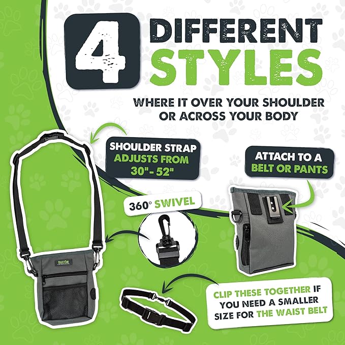- Ultimate Versatility: We designed our dog treat bag for leash with a multi-purpose belt sling and a metal clip. Wear over the shoulder, across your body, around your waist, or on your belt! Our strap adjusts from 30â- 52â to fit all sizes!