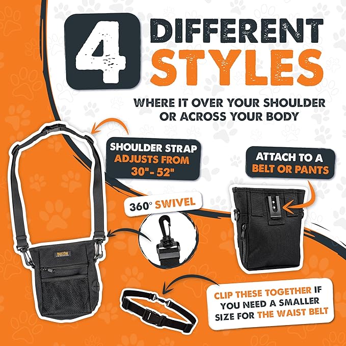 - Ultimate Versatility: We designed our dog treat bag for leash with a multi-purpose belt sling and a metal clip. Wear over the shoulder, across your body, around your waist, or on your belt! Our strap adjusts from 30â- 52â to fit all sizes!