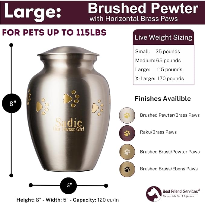 - Beautifully Crafted Custom Pet Urn: Remember your beloved pet with a custom pet memorial like the Large Pewter with hand carved Horizontal Brass Paws or choose from a variety of other colors to remember your best friend. This elegant display urn will look great on a mantle shelf nightstand or anywhere you'll want it to be proudly displayed. The bottom features a felt bottom scratch-resistant padding to protect your furniture and wood finishes.