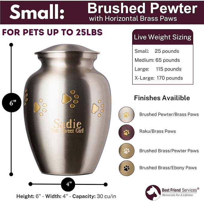 - Beautifully Crafted Custom Pet Urn: Remember your beloved pet with a custom pet memorial like the Small Pewter with hand carved Horizontal Brass Paws or choose from a variety of other colors to remember your best friend. This elegant display urn will look great on a mantle shelf nightstand or anywhere you'll want it to be proudly displayed. The bottom features a felt bottom scratch-resistant padding to protect your furniture and wood finishes.