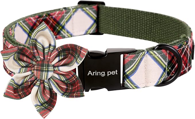 ARING PET Christmas Dog Collar, Cute Xmas Red Green Plaid Detachable Flower Pet Collar with Metal Buckle for Puppy Small Medium Large Boy Girl Dog-M