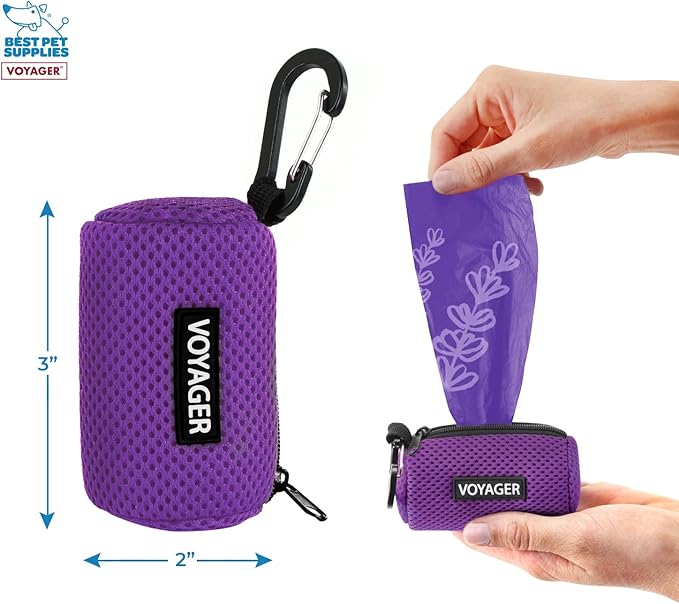Best Pet Supplies Dog Poop Bag Holder Leash Attachment with 15 Bags, Purple, Reusable Mesh Dispenser Pouch for Travel, Walking, Park, and Outdoor Use, Soft and Durable with Clip-On