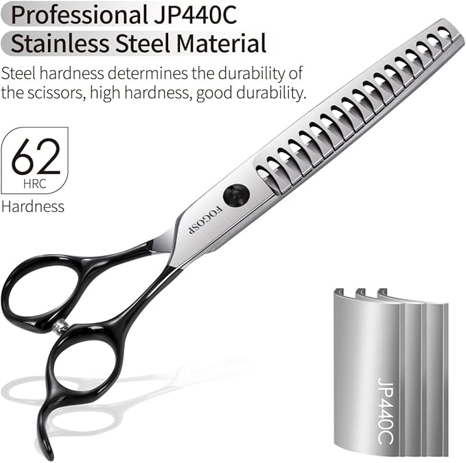 - 🐶[Sharp, Smooth & Efficient] FOGOSP dog grooming thinning shears is made of Japanese 440C stainless steel, which means an extra durability, and a superbly sharp convex edge to the superior cutting action. The pet grooming scissors has a finely honed blade and perfect design for western hands, ensuring you will cut more dog hair efficiently and comfortably, which is a great choice of professional right handed pet groomer.