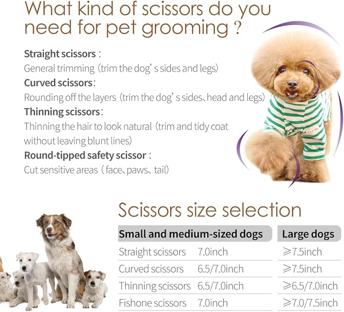 - 🐶[Great Gift Idea] The dog cutting scissors for grooming is ideal for a pet hospital, pet salons, and family to use on dogs, cats, and so on. You can become a professional pet groomer at home, Saving Time and Money, More is make you enjoy the feeling of taking care of your four-legged family member. The pet scissors for grooming is also definitely the perfect gift for relatives and friends, especially for dog or cat lovers.