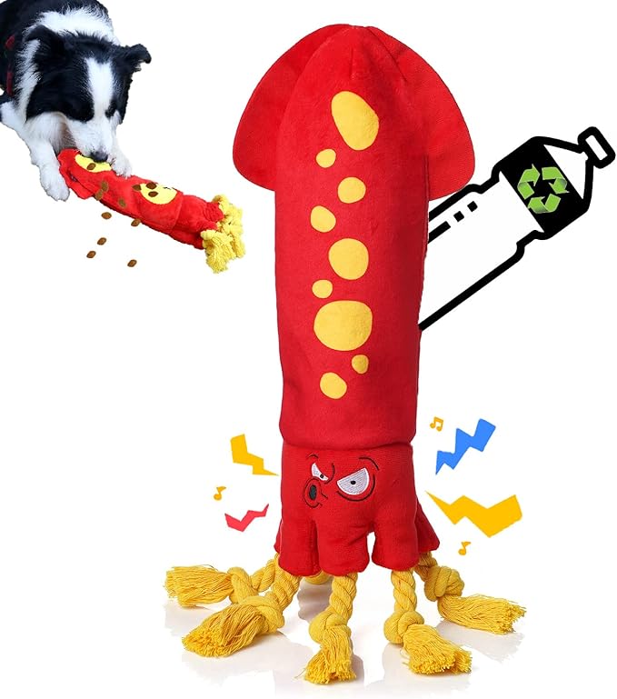 Water Bottle Dog Toys - Dog Puzzle Squeaky Enrichment Treat Dispensing Rope Snuffle Plush Toy, No Stuffing Durable Soft Crunchy Toys for Small Medium Large Dogs Puppy - Octopus Squid