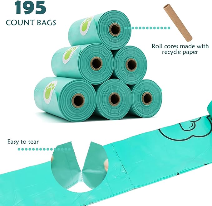Dog Poop Pickup Bags Holder Dispenser with Standard-Sized Leak-Proof Scented Doggy Waste Bags and Carabiner with Safety Lock&Fastener Never Loose on Leash Lead Again (1 Holder 195 Bags, Grey)