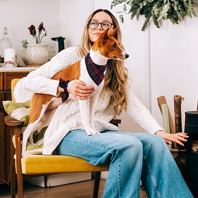 E-Clover Christmas Dog Bandanas & Matching Scrunchie Set Plaid Dog Scarf Bibs Pet Handkerchief for Small Dogs Puppy Owner Gifts Red Blue