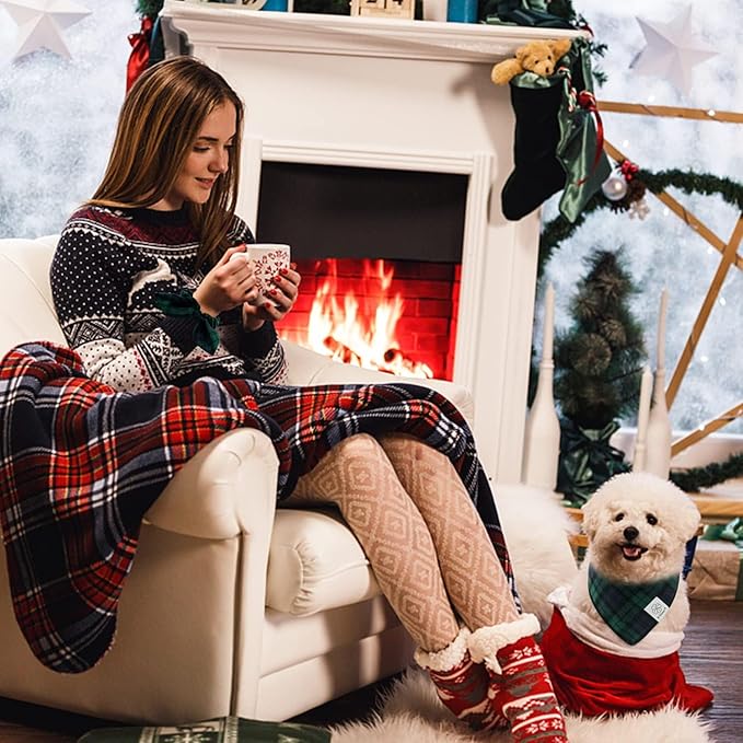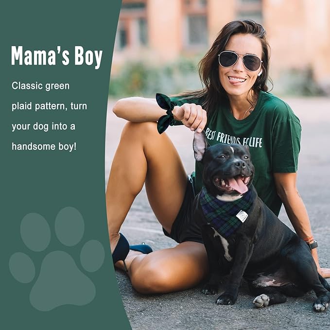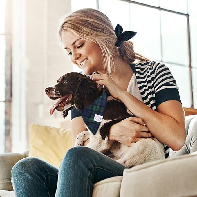 E-Clover Christmas Dog Bandanas Boy & Matching Scrunchie Set Plaid Scarf Kerchief for Small Dog Puppy Bandana Pet Owner Blue Green Fall