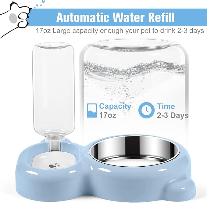 Dog Bowls, Cat Food and Water Bowl Set with Water Dispenser and Stainless Steel Bowl for Cats and Small Dogs - Light Blue