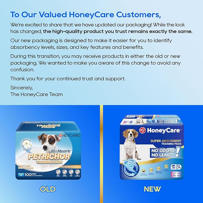 Honey Care All-Absorb Puppy Training Pads Made in The USA! Ultra Absorbent and Odor Eliminating, Leak-Proof 5-Layer Potty Training Pads 22"x23" with Quick-Dry Surface