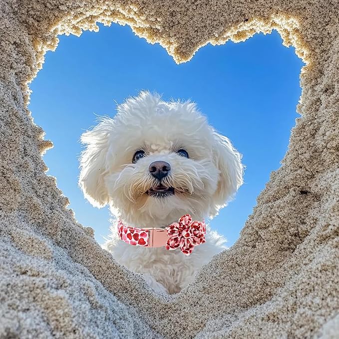 Maca Bates Valentine's Day Dog Collar with Floral Bow for Small Girl Boy Dogs,Red Love Hearts Pattern,Adjustable Durable Soft Valentine Gift for Female Male Puppy