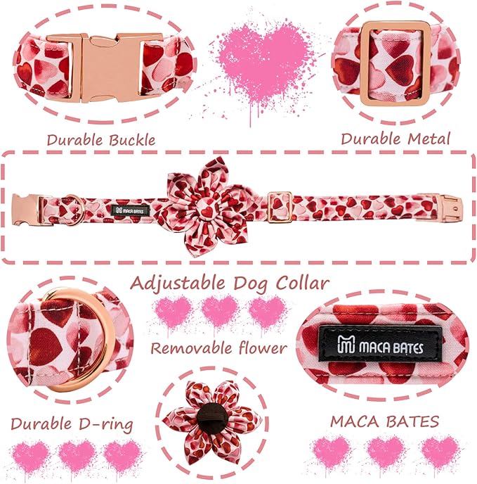 Maca Bates Valentine's Day Dog Collar with Floral Bow for Large Girl Boy Dogs,Red Love Hearts Pattern,Adjustable Durable Soft Valentine Gift for Female Male Puppy