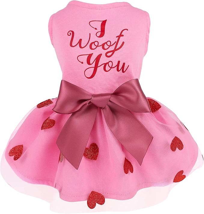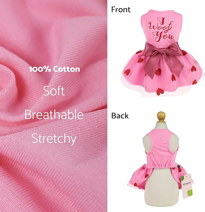 Fitwarm I Woof You Valentines Dog Dress 100% Cotton Girl Dog Clothes Pet Apparel Doggie Tutu with Bowknot Cat Clothing Puppy Dresses Doggy Costume Attire Pink X-Small