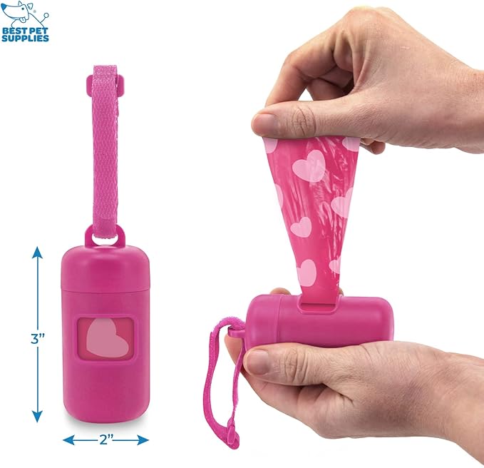 Best Pet Supplies Dog Poop Bag Holder Leash Attachment with 30 Bags, Reusable Dispenser for Travel, Walking, Park, and Outdoor Use, Durable with Clip-On - Fuchsia, Pack of 2