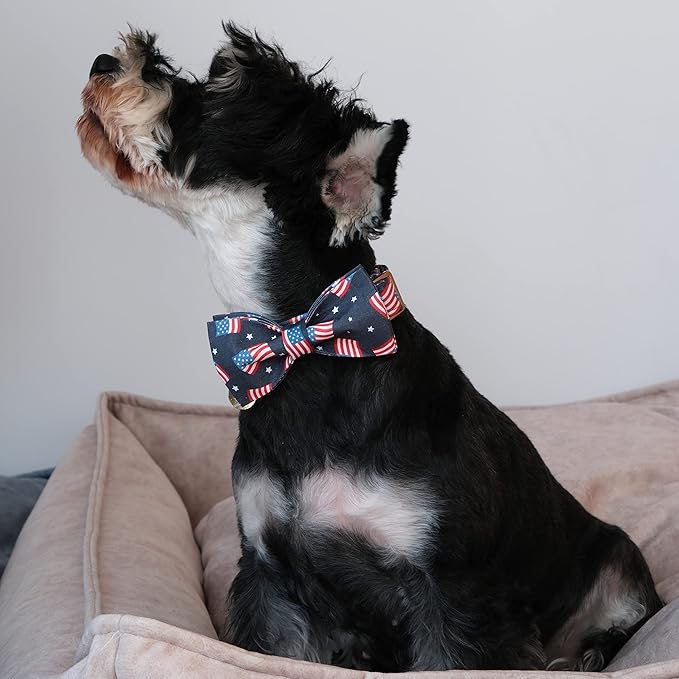American Flag Dog Collar with Bow Tie, 4th of July Comfortable Cotton Cute Dog Collar with Metal Buckle, Patriotic Bowtie Collar for Puppy Girl Boy Dog, L