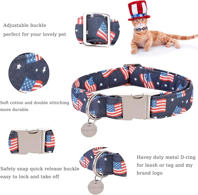 American Flag Dog Collar with Bow Tie, 4th of July Comfortable Cotton Cute Dog Collar with Metal Buckle, Patriotic Bowtie Collar for Puppy Girl Boy Dog, M