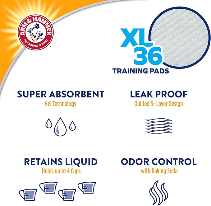 Arm & Hammer for Dogs XL Training Pads | 30% Larger Coverage, New & Improved Super Absorbent, Leak-Proof, Odor Control Quilted Dog Training Pads with Baking Soda| 36 Count - 4 Pack Wee Wee Pads