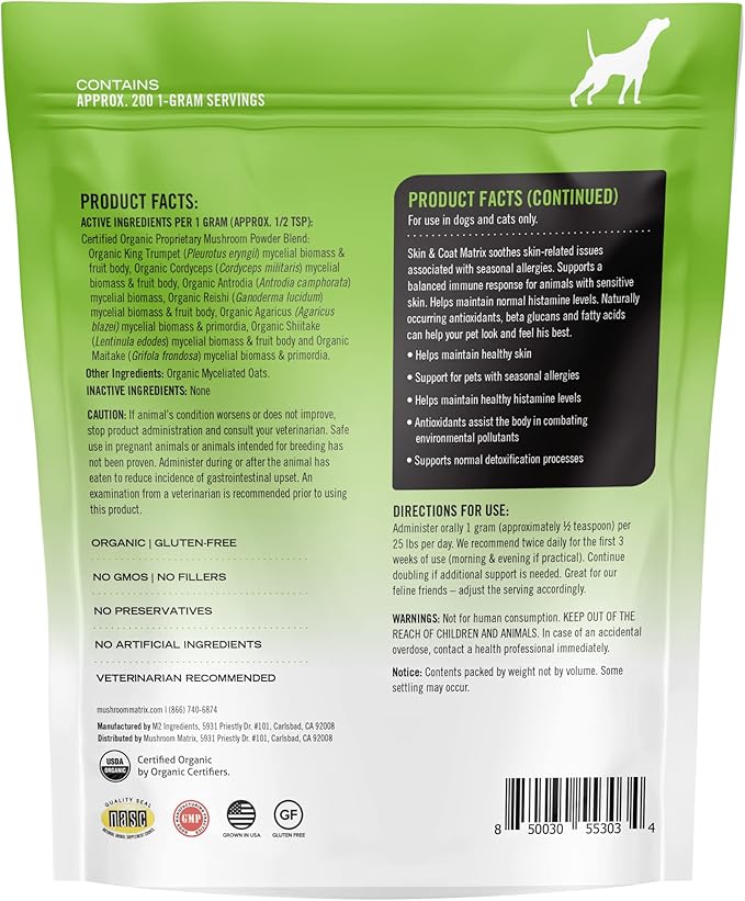 Om Mushroom Matrix Skin & Coat Mushroom Pet Supplement, Provides Seasonal Allergy Skin & Coat Support for Dogs & Cats, 200 Grams, 7.1 oz
