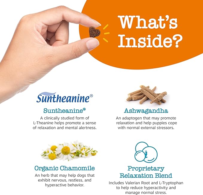 - Treat Your Puppy to Great Ingredients – Includes a Relaxation Blend with Valerian Root and L-Tryptophan, plus Organic Chamomile, Organic Passionflower, Organic Ginger Root, and Magnesium Citrate.