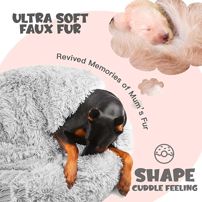 Himax Donut Dog Beds for Large Dogs with Blanket, Cozy Soft Fluffy Round Dogs Beds, Calming Dog Bed Washable (20"/26"/35") Light Grey