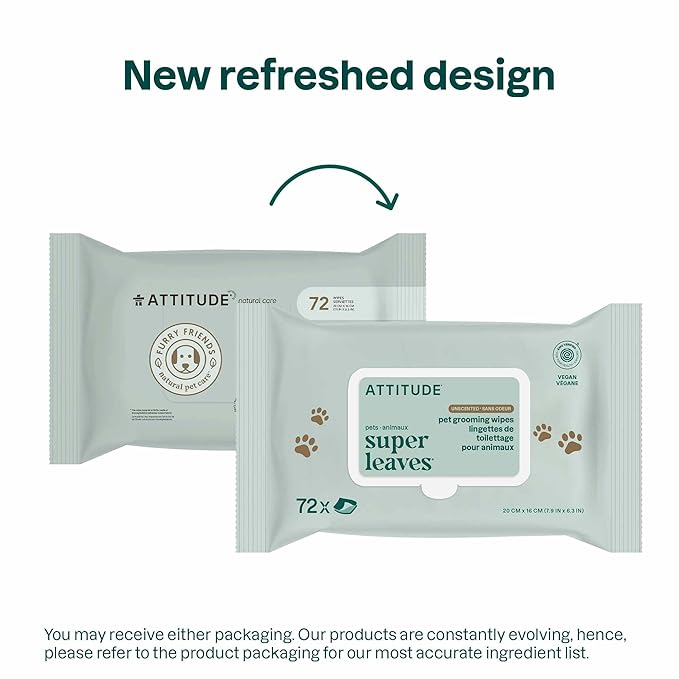 ATTITUDE Pet Wipes for Dogs & Cats, 99% Water, EWG Verified, Gentle & Unscented Cleaning Wipes for Paws, Ears, Face & Body, Deodorizing, Safe for Puppies & Kittens, 72 count