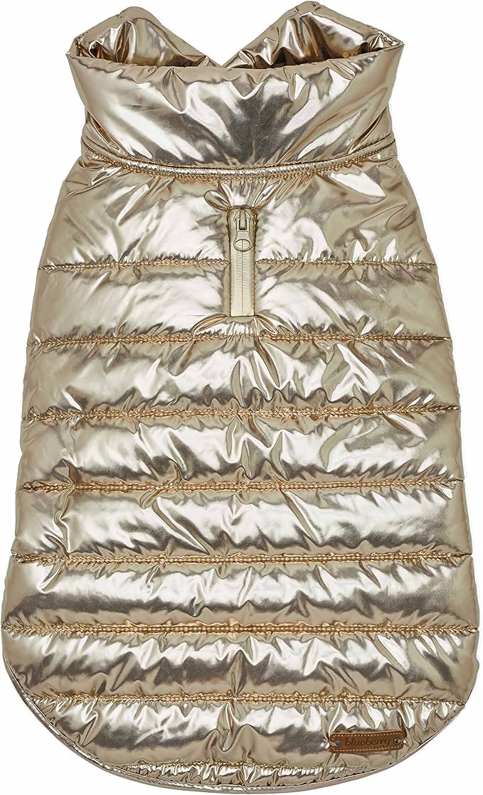 Blueberry Pet Cozy Windproof Puffer Jacket – Glossy Gold Winter Coat for Medium-Sized Dogs, Size 14 (15.75" Back Length), Easy On/Off Design with Leash Hole, Stylish Outdoor Accessories
