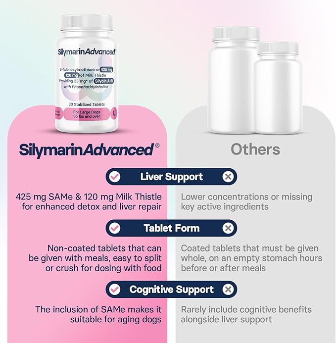 - ADVANCED LIVER HEALTH SUPPORT – With your beloved fluff's health in mind, our milk thistle supplement for dogs provides powerful liver support with 425mg of SAMe and 35mg of Silybin from Milk Thistle, aiding in liver detox and repair. Keep your dog liver health at its best.