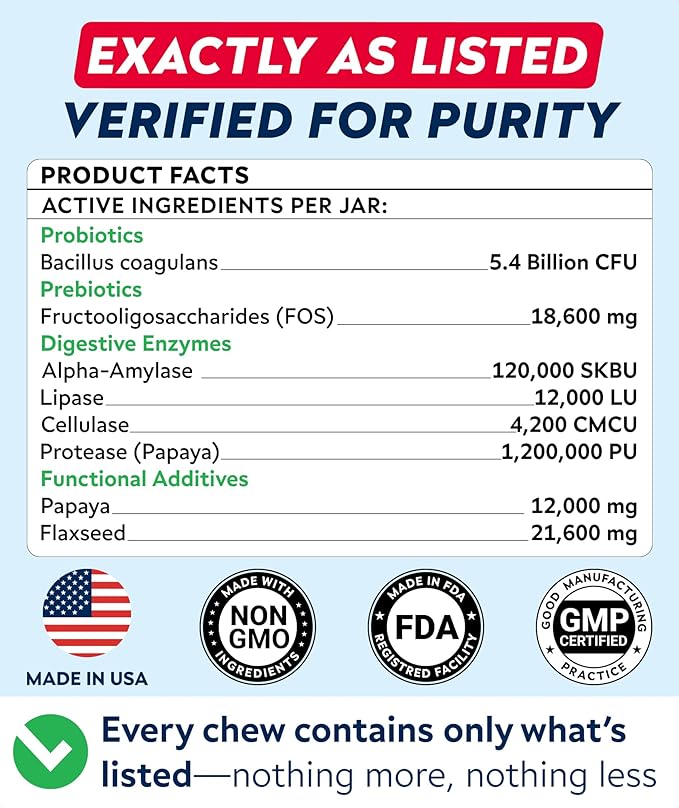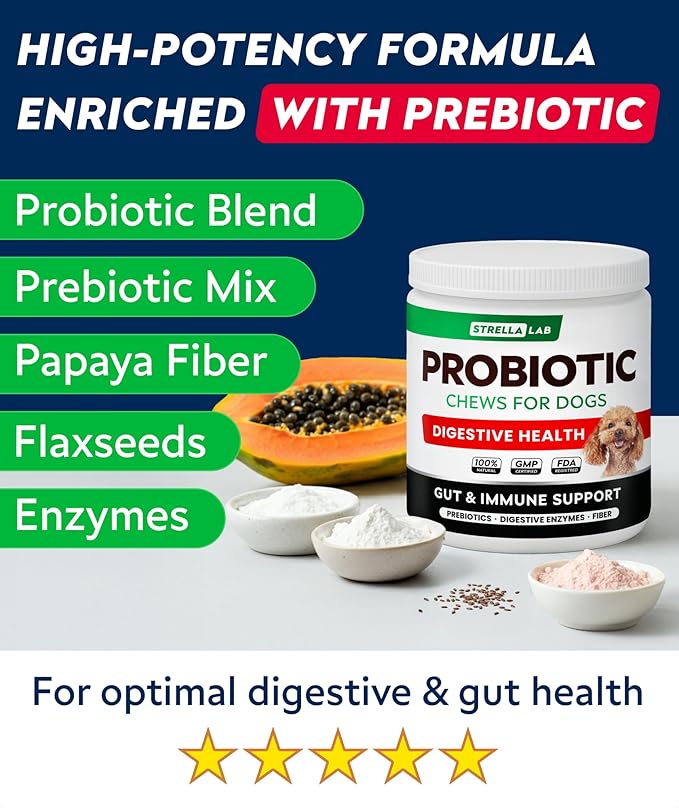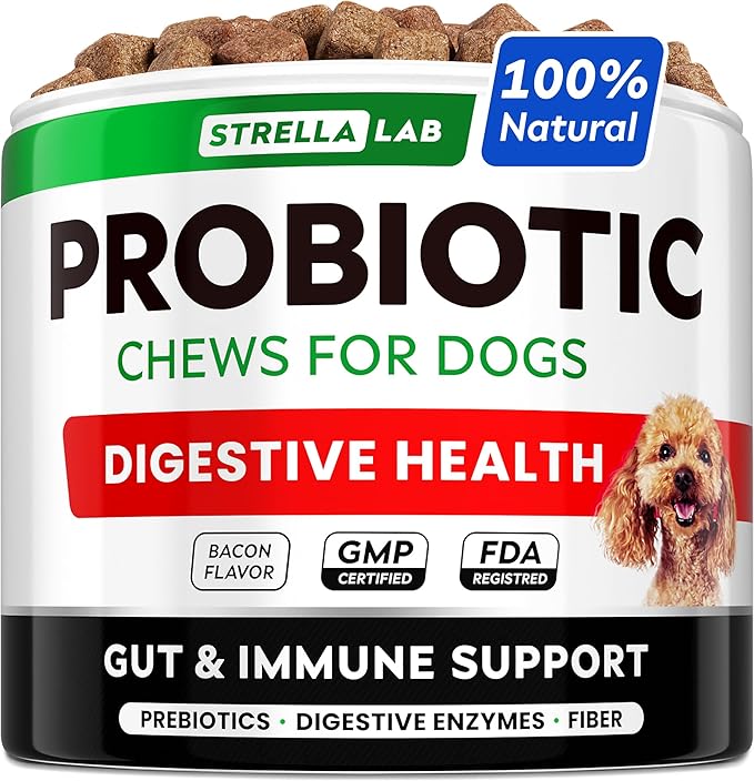 StrellaLab Dog Probiotics Treats for Picky Eaters - Digestive Enzymes + Prebiotics - Chewable Fiber Supplement - Allergy, Diarrhea, Gas, Constipation, Upset Stomach Relief - Improve Digestion&Immunity