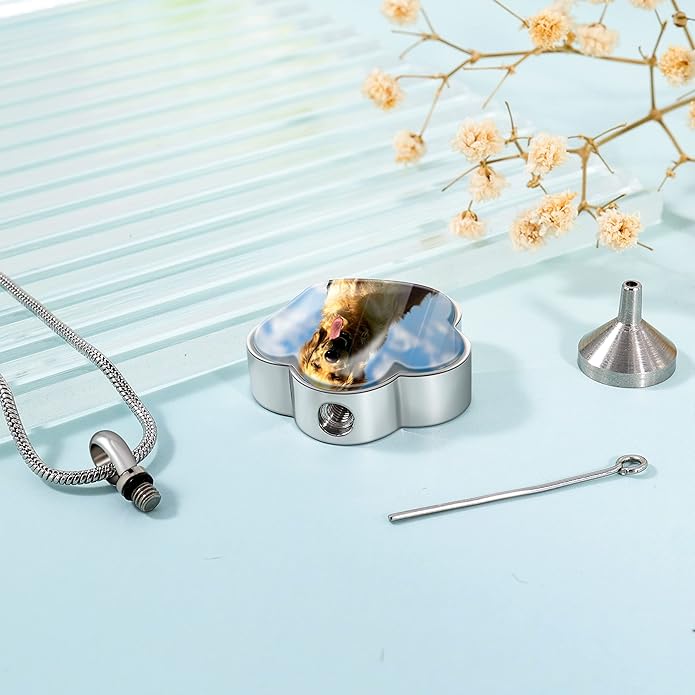 - 【What Does The Package Contain】Contains 27mm stainless steel plum blossom shape pet urn pendant,0.15 x 60 cm chain,1 x Farfume jewelry box,with a kit add ashes. Not only a special gift for someone who has lost a loved one or a beloved pet, but also a support to help them through their grief.