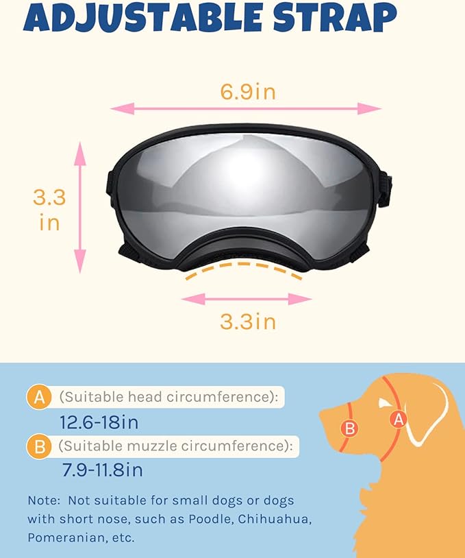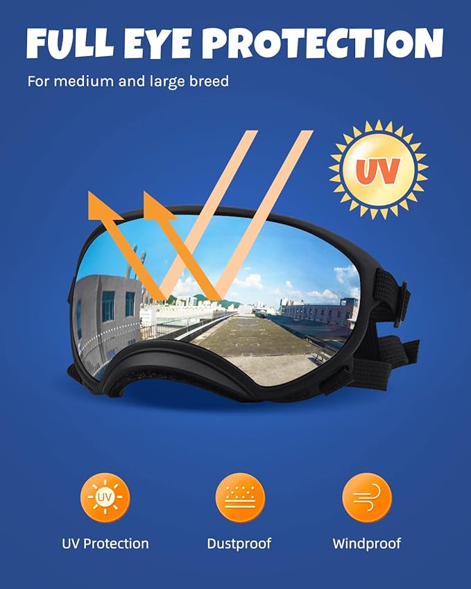 Large Dog Sunglasses, Dog Goggles Large Breed and Medium, UV Protection, Windproof, Dustproof and Snowproof. Shatterproof Lens, Adjustable Strap