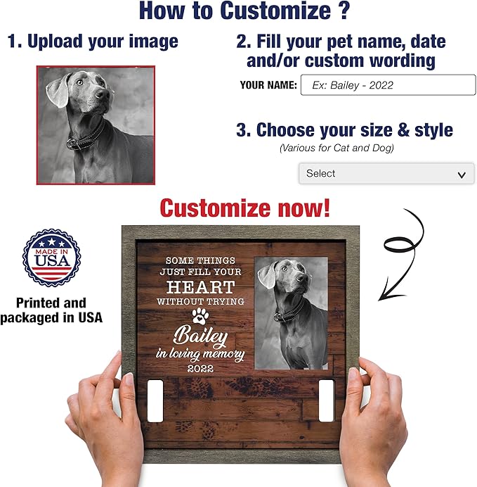 - ITEM DIMENSIONS: Our customized pet loss sign comes in two sizes, 8x8" and 8.7x10.6," and serves a variety of purposes. Additionally, you may use a personalized pet memorial frame as a table decoration or as a part of your home decor by placing it on a shelf, mantle, table, or wall. It will be a lovely pet memorial piece.
