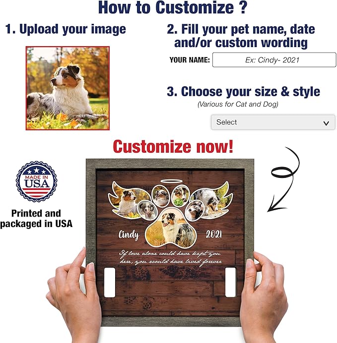 - ITEM DIMENSIONS: Our customized pet loss sign comes in two sizes, 8x8" and 8.7x10.6," and serves a variety of purposes. Additionally, you may use a personalized pet memorial frame as a table decoration or as a part of your home decor by placing it on a shelf, mantle, table, or wall. It will be a lovely pet memorial piece.