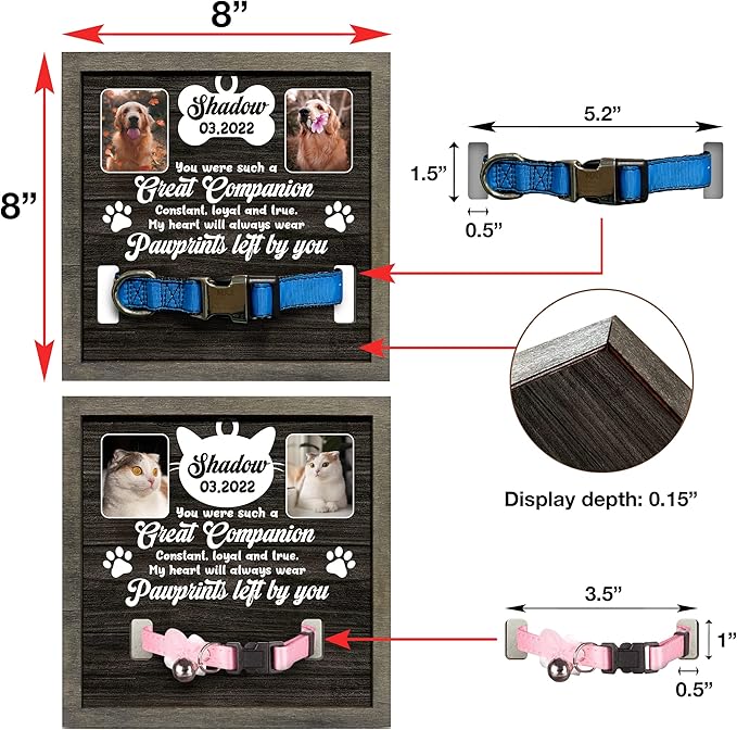 - HIGH-QUALITY MATERIAL: The cat collar picture frame for dog lovers is made of sturdy Plywood. Furthermore, we have two frame colors to choose from: grey and walnut. Having a beautiful keepsake to look at every day can help to alleviate some of the pain. Please keep in mind that the pet collar is NOT included.