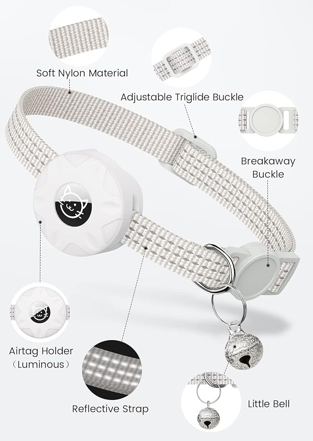 Apple AirTag Cat Collar, GPS Tracker Kitten Collar with Breakaway Feature, Lightweight and Reflective, Suitable for Cats, Kittens and Puppies (White)