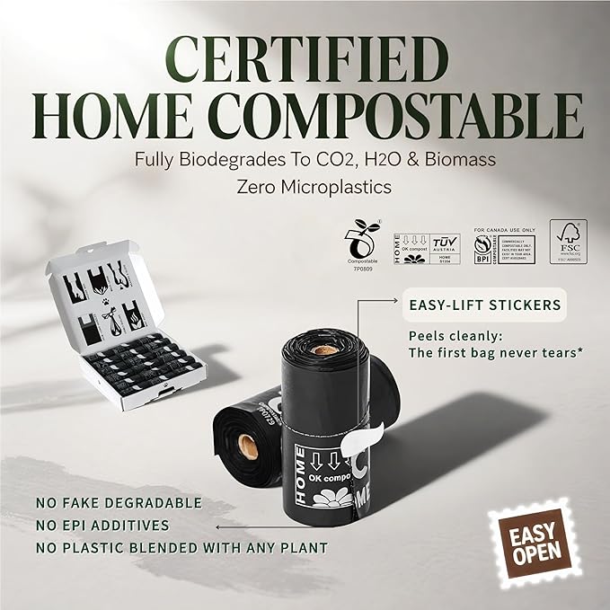 - [🌱 Certified Compostable in 90-180 Days] Cleans up while purifying the enviroment! Our thick dog poop bags are plastic-free and free of heavy metals. They decompose naturally into water, CO₂ & biomass. Certified to TÜV OK home compostable, ASTM D6400 and EN13432 standards!